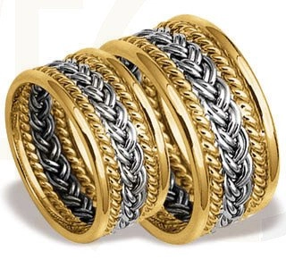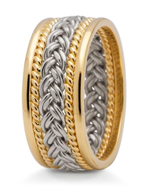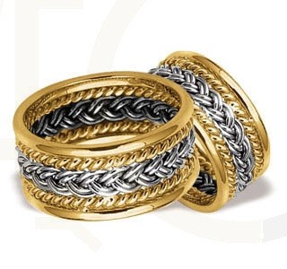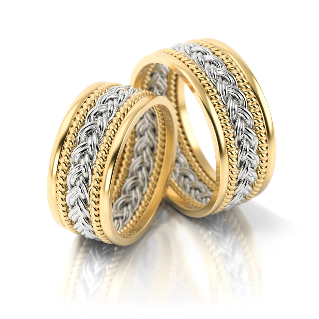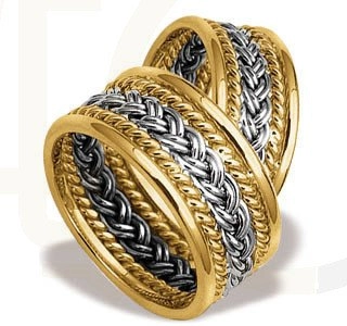 Wyjątkowa obrączka, wykonana z ręcznie plecionych warkoczy złota w kolorze białym oraz żółtym.