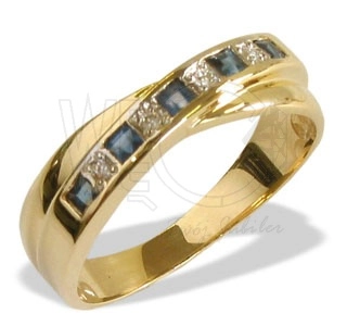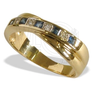 Dwa przenikające się złote kręgi przełamują klasyczną formę tego pierścionka, nadając mu charakterystycznego kształtu o niebanalnym wyrazie. Zastosowanie kamieni o rożnych szlifach (w przypadku diamentów to brylant okrągły, zaś szafirów – princessa kwadrat) i naprzemiennie ułożonych czyni z niego ozdobę elegancką, lecz niepozbawioną odrobiny radosnego szaleństwa.