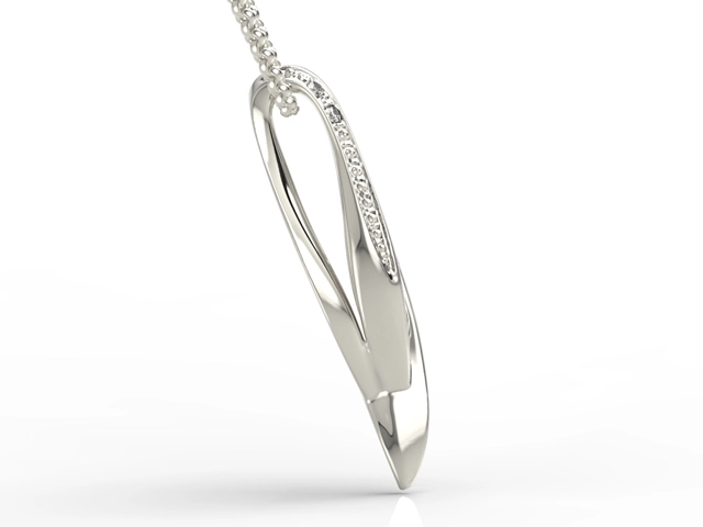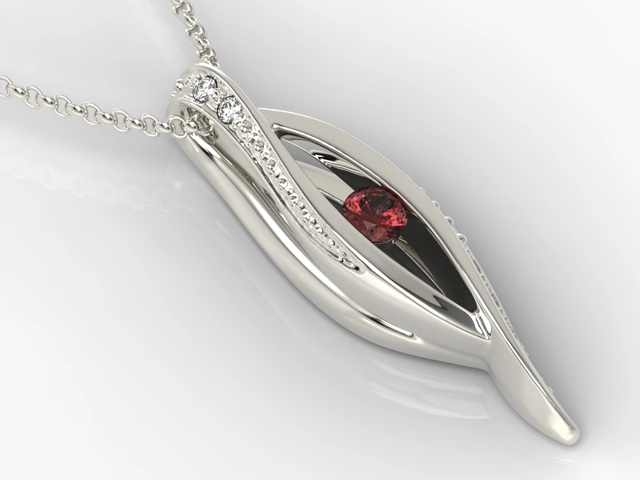 Wstążki białego, błyszczącego złota uformowano tak, aby tworzyły zarys powiek. Osadzone w kruszcu diamenty o łącznej masie 0,03 ct. otaczają jubilerskie oko rzędem „rzęs” chroniących wyjątkową, kontrastującą z tym monochromatycznym tłem źrenicę.
