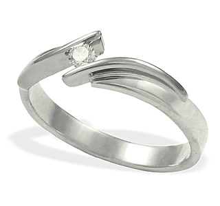 Kluczowy w całej kompozycji kamień – mimo że niezwykle urodziwy – wydaje się być jedynie słusznym dodatkiem podkreślającym piękno wyrafinowanej formy obrączki. Złote wstążki pierścionka wiją się w symetryczny sposób, tworząc kompozycję idealnie wyważoną, doskonale geometryczną, pięknie konceptualną. Pasma białego złota spotykają się po to, aby stworzyć nietuzinkową koronę dla centralnego diamentu o szlifie brylantowym okrągłym.