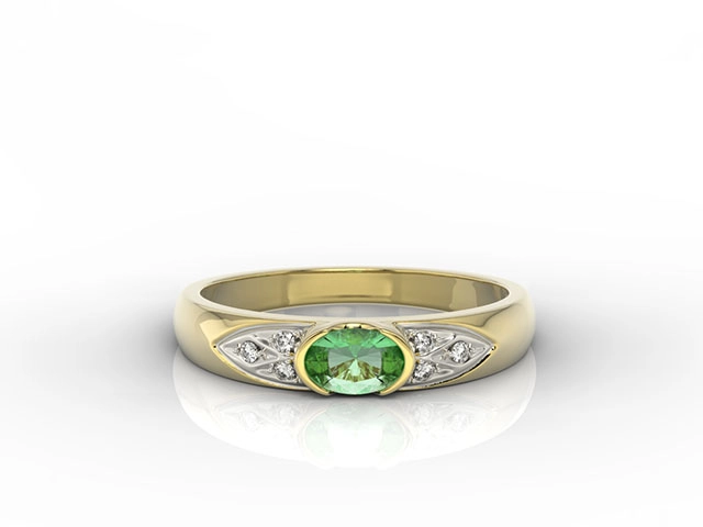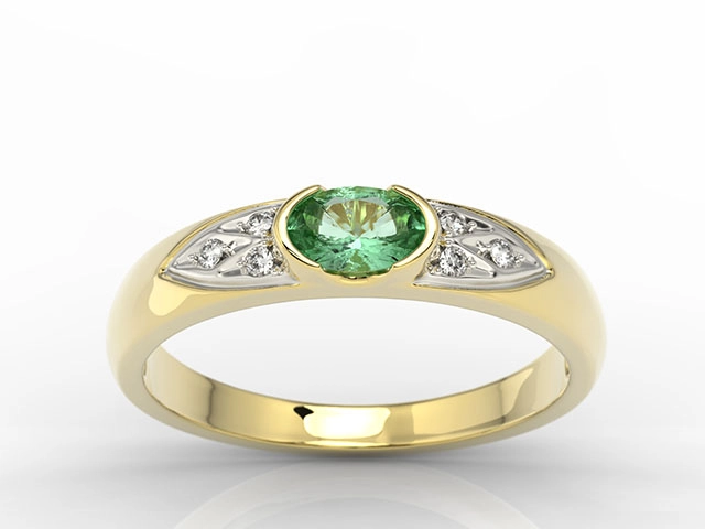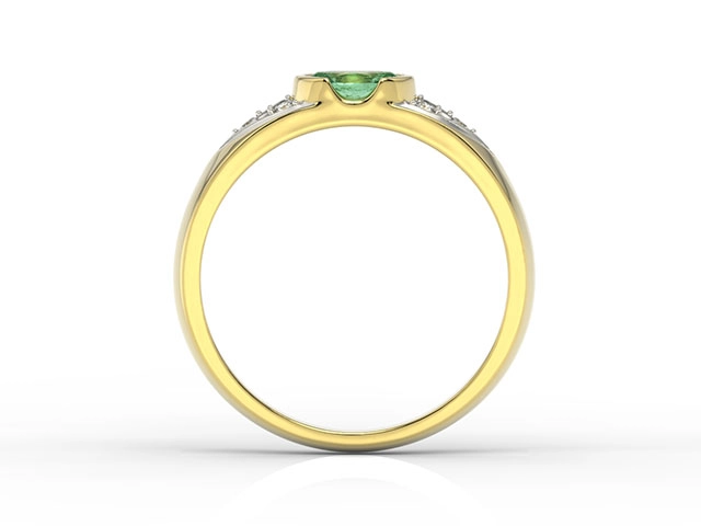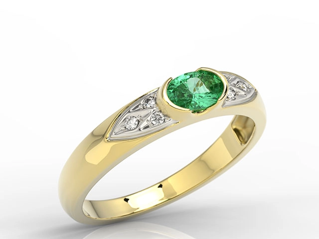 Sercem kompozycji jest przepiękny szmaragd o szlifie fasetowym owalnym. Umieszczony w złotej koronie kamień wyeksponowano w towarzystwie symetrycznie rozłożonych diamencików, które – skupiając w sobie promienie – pięknie oświetlają i uwypuklają kontrastującą zieleń centralnego oczka.