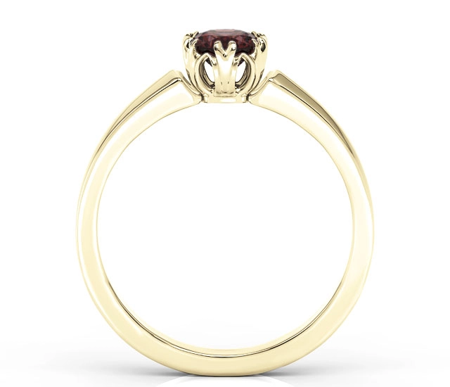 Starannie osadzony w złotej oprawie wcześniej wspomniany granat, robi niezwykłe i niezapomniane wrażenie. Wygodę noszenia pierścionka zapewnia właśnie miękko wykończony kształt obrączki wykonanej z żółtego złota pr.0,585. Pierścionek może towarzyszyć na co dzień lub dopełniać elegancką stylizację.