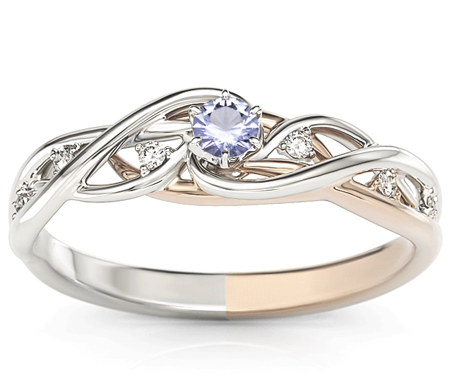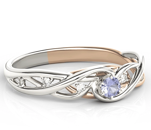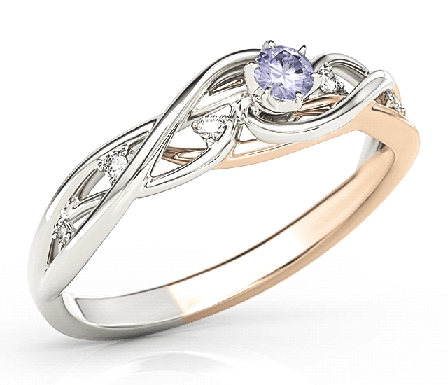 Tanzanit, stosunkowo mało znany kamień szlachetny, ale warty zainteresowania. Znaczenie minerału można odczytywać na dwa sposoby jako symbol miłości, bogactwa i udanego życia oraz cech duchowych wiedzy i mądrości. Osadzony w oprawie z połączonych dwóch barw złota różowej i białej. Razem z okrągłymi towarzyszącymi mu brylantami zawojują serce wybranki.