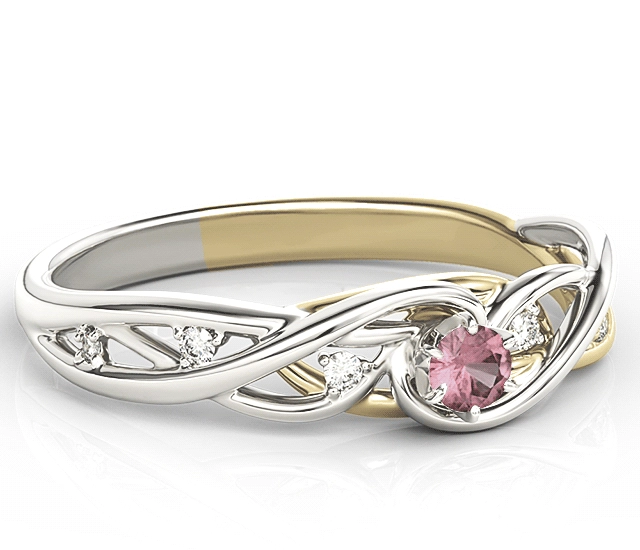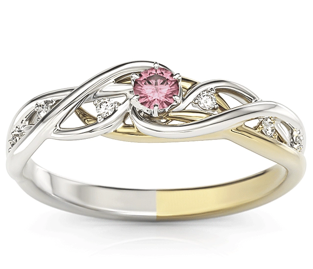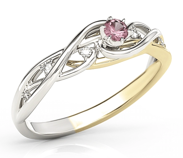 Niezwykle bogata propozycja z użyciem dwóch barw kruszców oraz dwóch różnych kamieni szlachetnych. Mimo wszystko proporcje wyważone są w taki sposób by nie kojarzyło się to ze zbytecznym przepychem. Okazały, szkarłatnoczerwony kamień pierścionka znajduje się w samym centrum uwagi, a dodatkowo wprawione okrągłe brylanciki podbijają blask i zwieńczają cały pierścień.