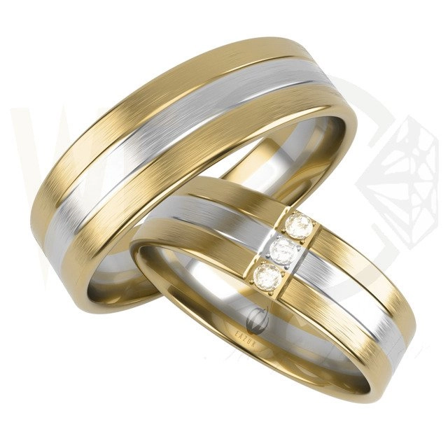 • Para obrączek. Obrączka damska z cyrkoniami. Oprawa nr. 4, cyrkonie 3x 1,75 mm, męska bez kamieni. Środek soczewka.