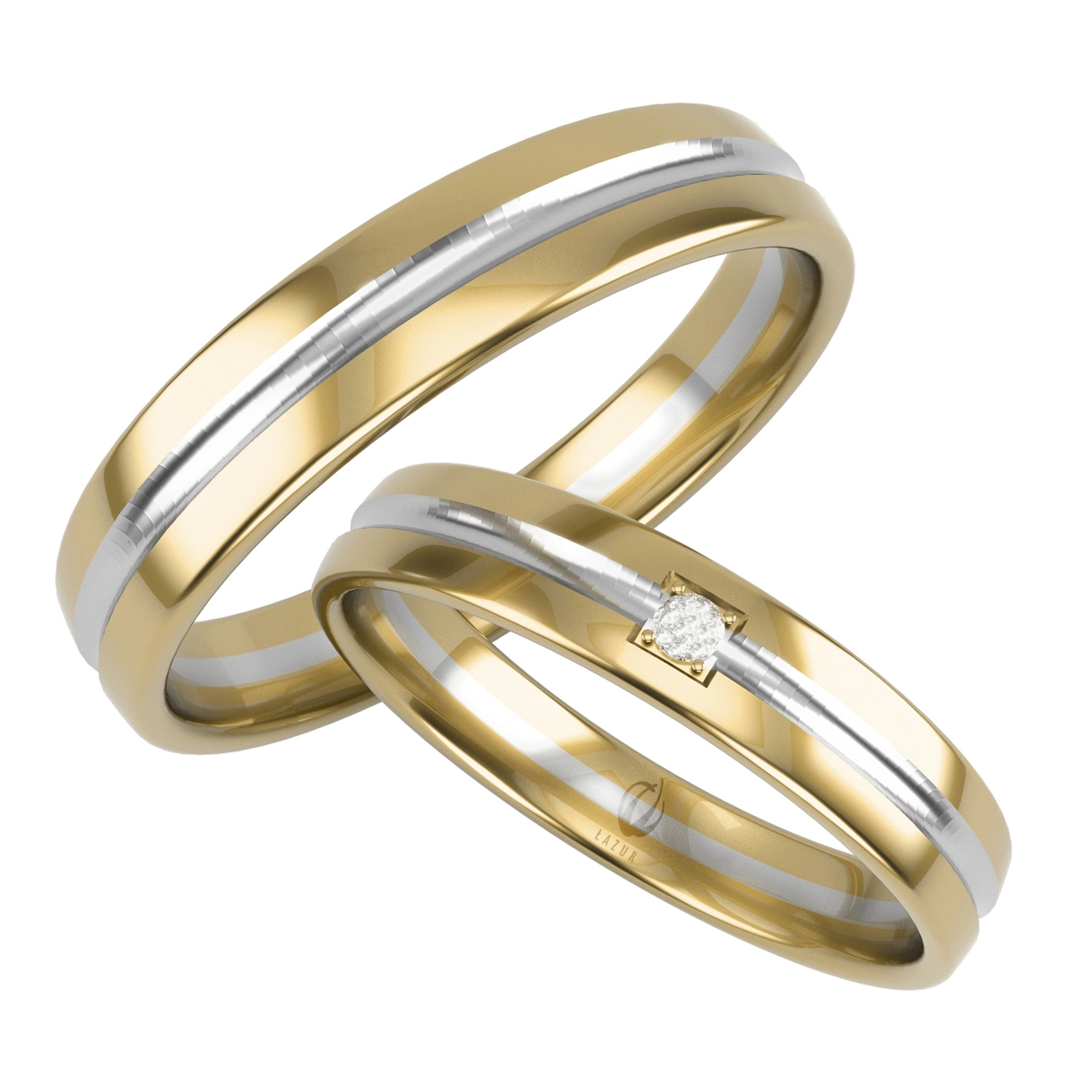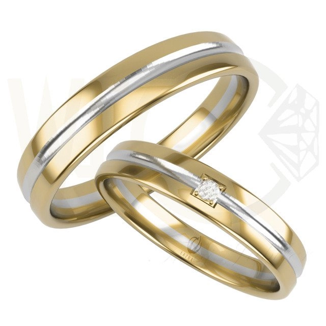 • Para obrączek, damska z cyrkonią. Oprawa nr. 5, 1 x 2,0mm, męska bez kamieni. Środek soczewka.