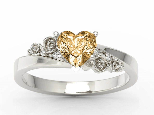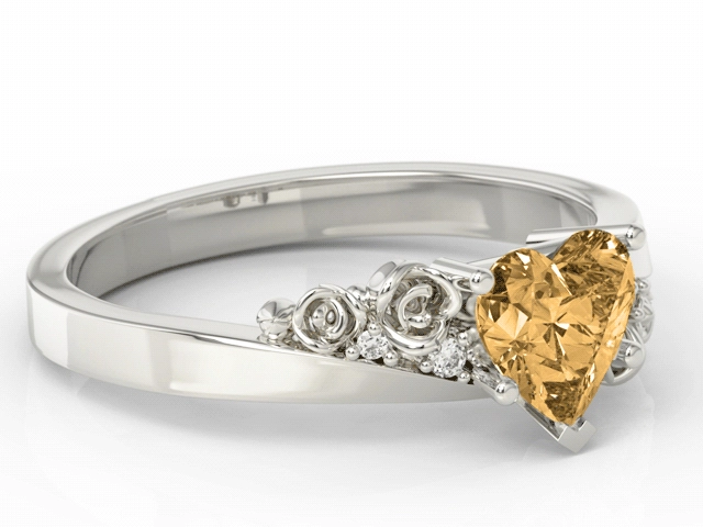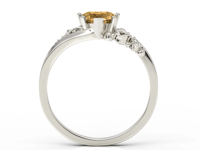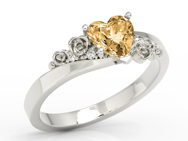 Pięknie wybarwiony, miodowy topaz, ujmujące blaskiem diamenty i dekoracyjne pąki kwiatów osadzone na finezyjnej obrączce z białego złota to romantyczny ideał i biżuteryjny klucz otwierający drzwi do kobiecego serca.