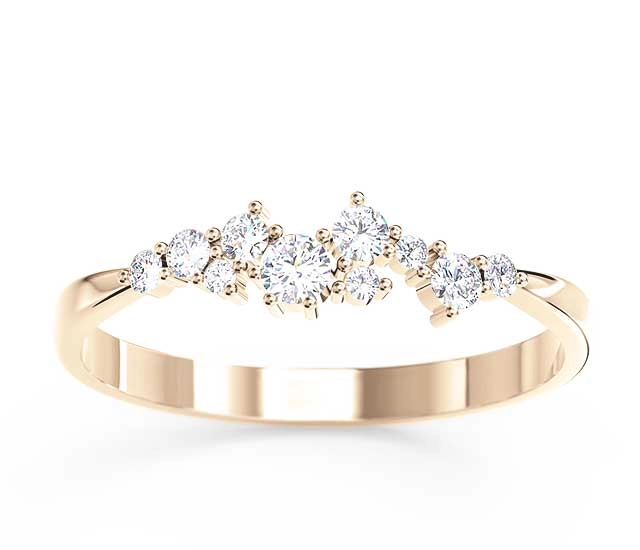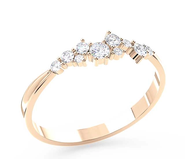 Wyjątkowy pierścionek z różowego złota z brylantem należy się wyjątkowej kobiecie. 10 migoczących diamentów ułożonych w nieregularnej smudze promienieje radosnym blaskiem. Różowe złoto, z którego został wykonany pierścionek z brylantem, jest doskonałym dopełnieniem czułej wymowy zaręczynowej biżuterii.