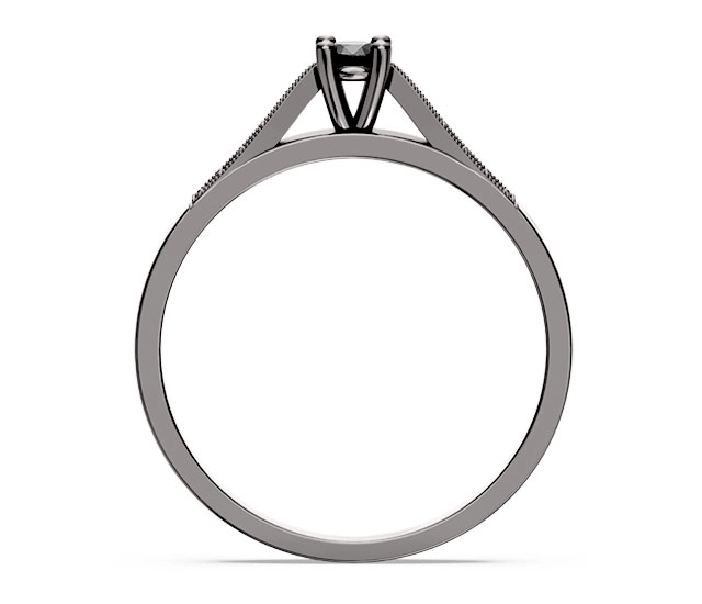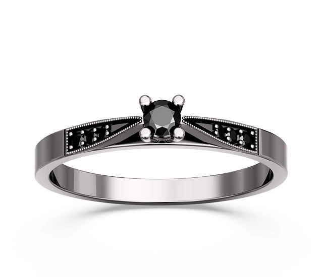 Prezentowany pierścionek wykonany został z białego złota, które przybrało ciemną barwę dzięki rodowanej na czarno powłoce. Zdobiące go czarne diamenty to wyjątkowe kamienie, wyróżniające się na tle innych lśniących okazów. Centralne i mniejsze poboczne brylanty stanowią wręcz perfekcyjne dopełnienie całości.