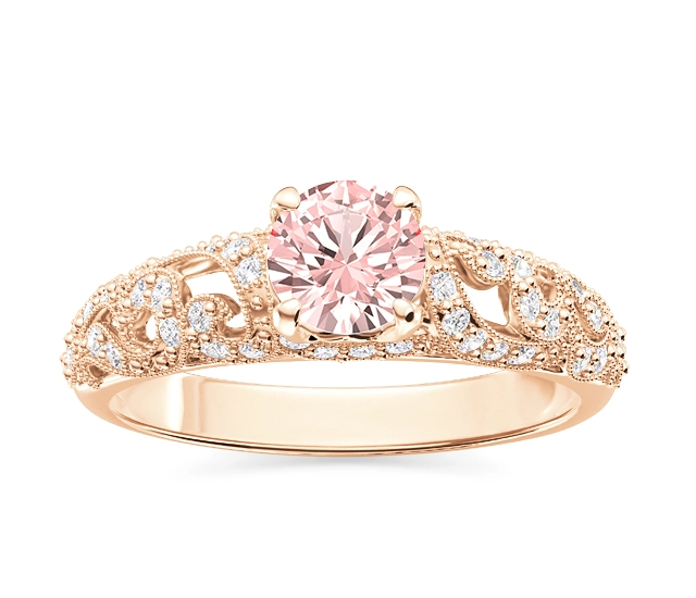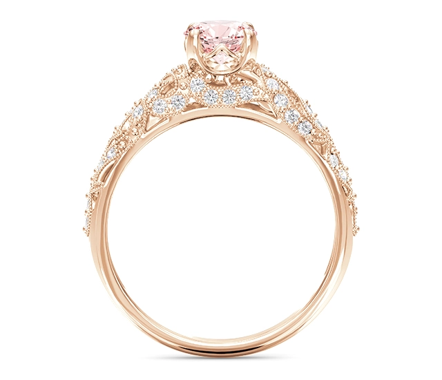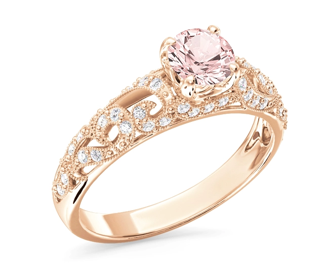 Oto pierścionek, który z pewnością stanie się ulubionym dodatkiem eleganckich kobiet. Bogato zdobiona obrączka z różowego złota zdobiona pięknie zaakcentowana jest osadzonym na podwyższonej koronie morganitem.