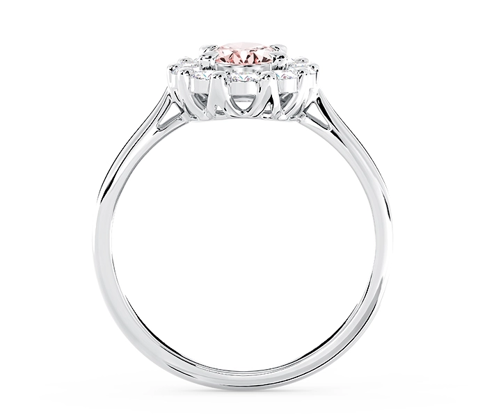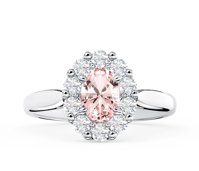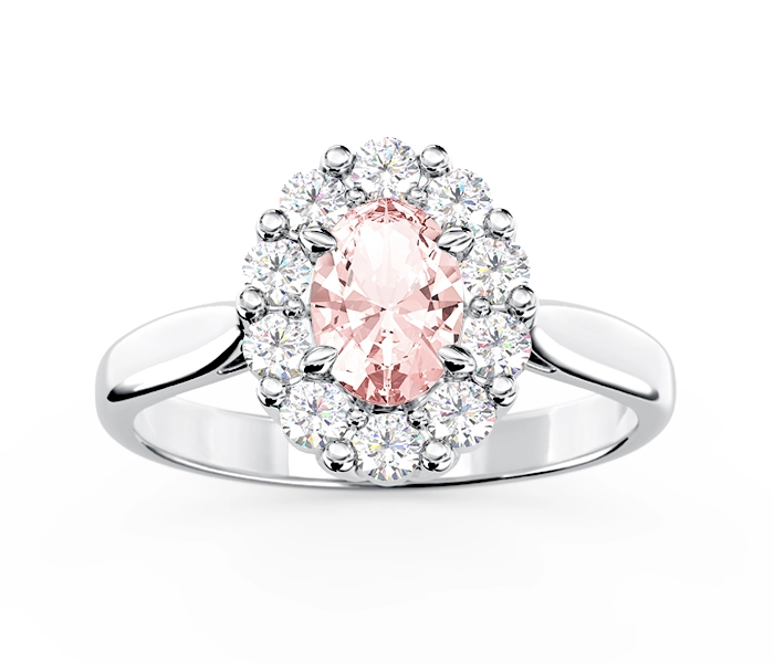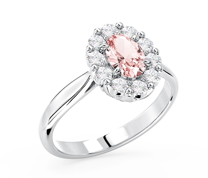 Olśniewające liczne diamenty oraz jeden centralny morganit to kamienie, które doskonale z sobą współgrają. Lśniące brylanty potęgują delikatnie różowy refleks morganitu powodując, że pierścionek na kobiecej dłoni prezentuje się niezwykle okazale i dumnie.